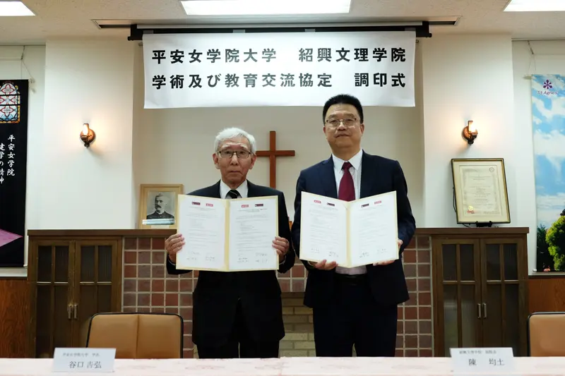 今回の訪問に際して、同日に紹興文理学院と本学との学術及び教育交流協定の調印式を執り行いました。紹興文理学院からは、陳 均土副学長、蘭亭書道芸術学部孫 仕龍副学部長ら5名がご出席されました。本学からは谷口 𠮷弘学長、毛利 憲一副学長ら4名が調印式に出席いたしました。