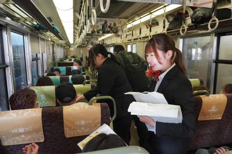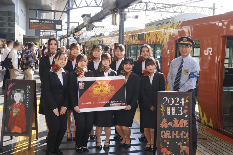 国際観光学部の学生は、例年、QRトレインのツアーにアテンドとして参加し、車内放送で森の京都エリアの魅力を伝えたり、パンフレットを配布したりとお手伝いを行ってきました。