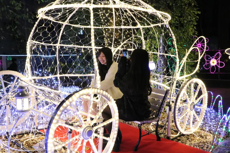 色とりどりの球体が浮かぶ光の海の中に、未来へ向かって進む馬車のモニュメントが設置されています。