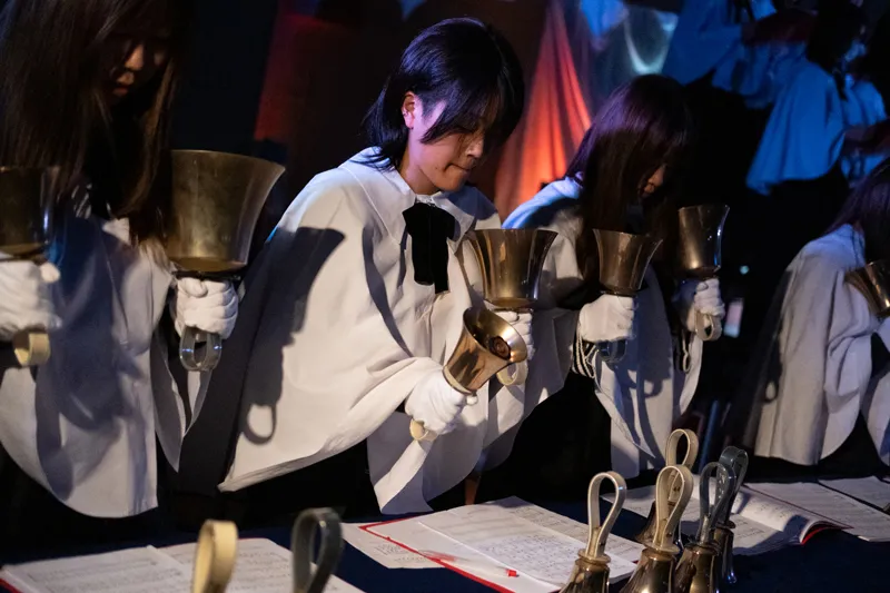 教会という荘厳な雰囲気の中、イエス・キリストの降誕物語を歌とハンドベルなどの演奏で彩りました。