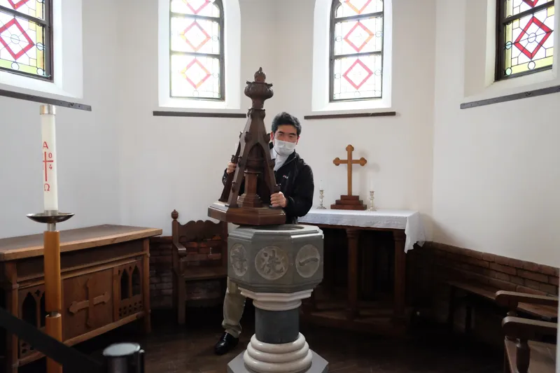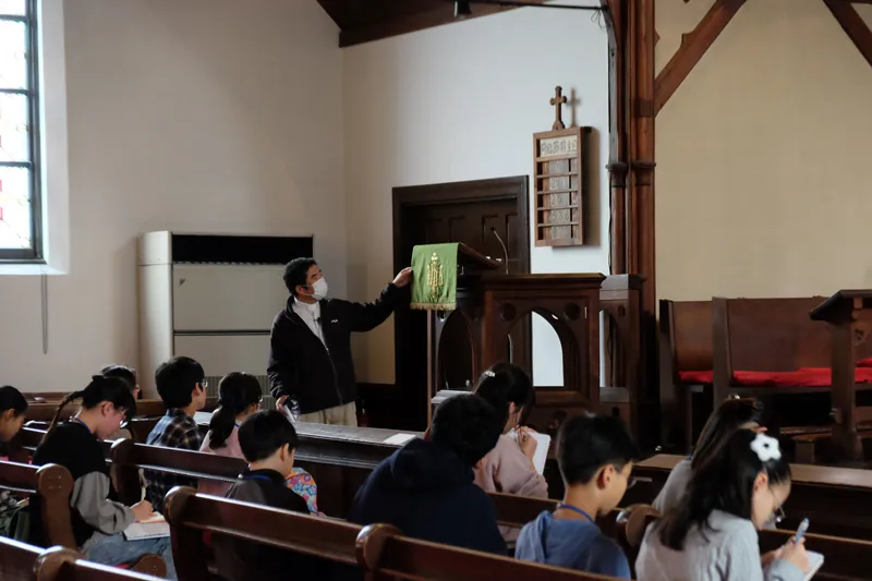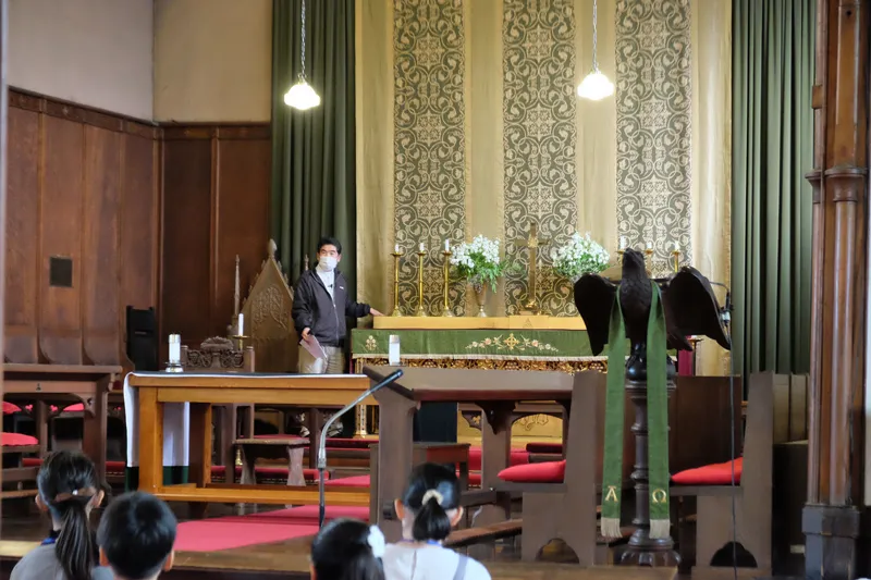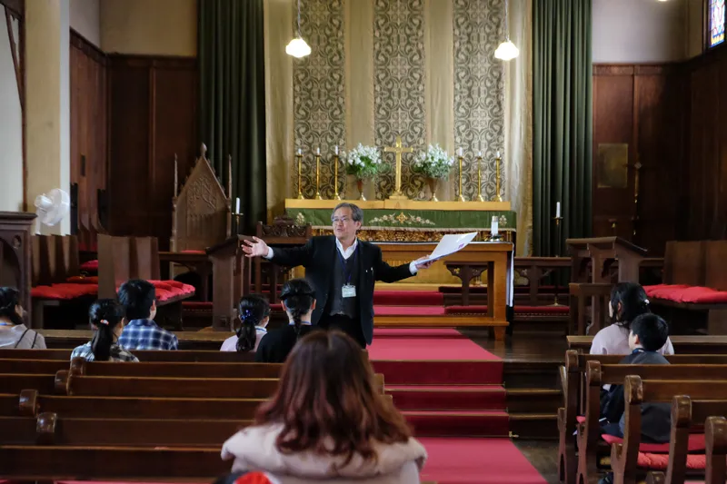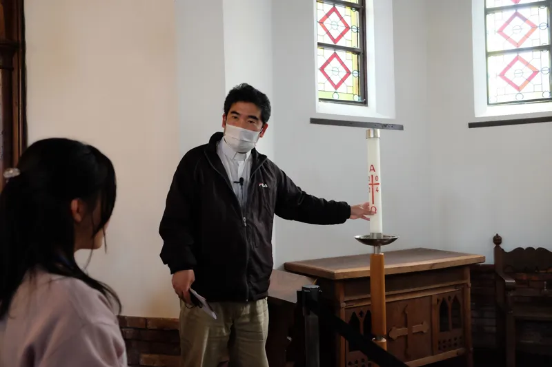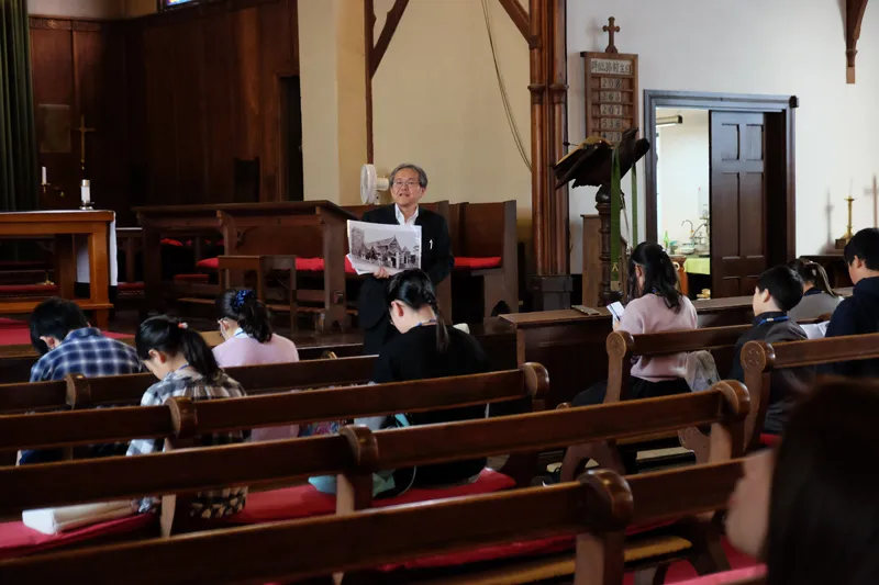 まず、国際観光学部 毛利教授が聖アグネス教会の歴史や建築物の特徴について、教会の過去の写真が載ったパネルを使いながら説明をいたしました。
