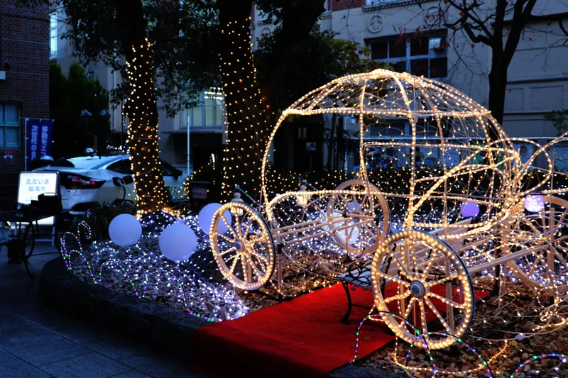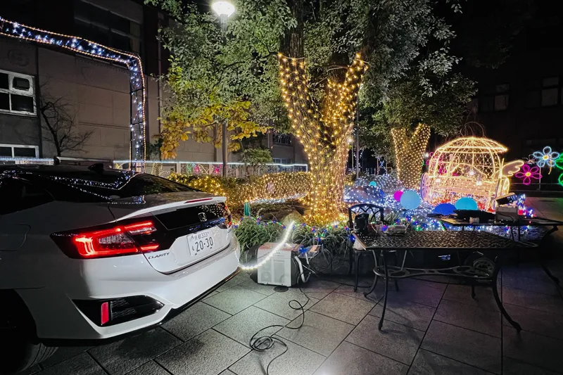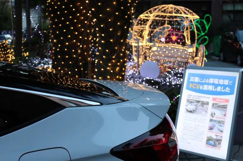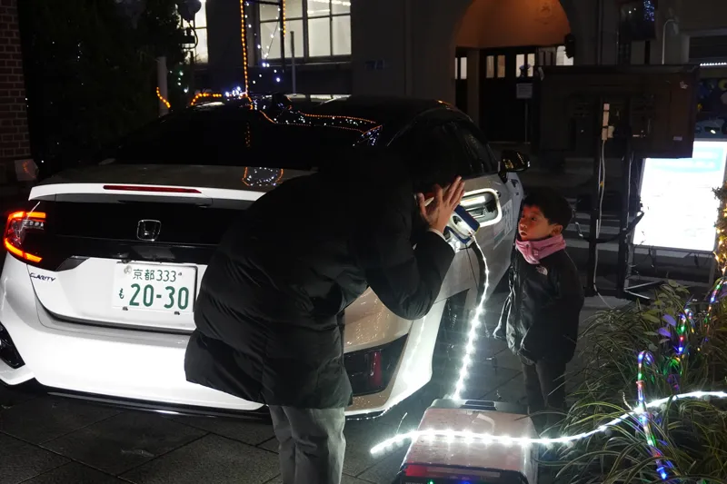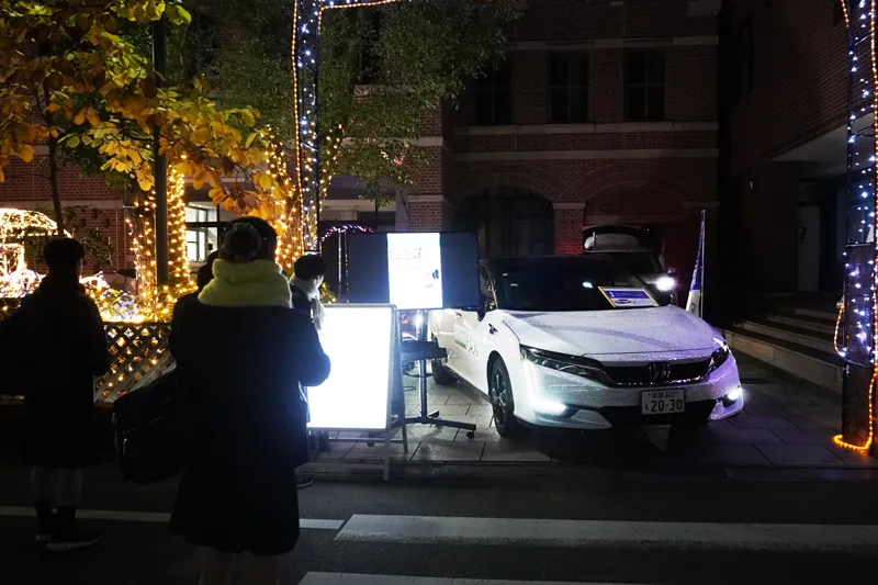 京都キャンパスにて現在点灯中のアグネス・イルミネーションが、12月12日(木)~14日(土)の3日間、プラグインハイブリット車・燃料電池自動車で給電する環境にやさしい再エネ※1100%で点灯しています。