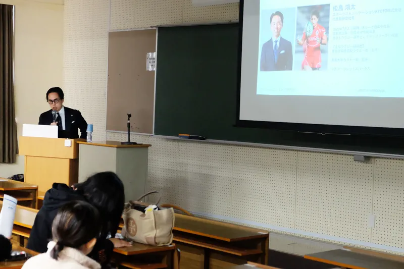 国際観光学部では、2025年1月20日(月)に、プロバスケットチーム「京都ハンナリーズ」の運営会社であるスポーツコミュニケーションKYOTO株式会社の代表取締役社長である松島鴻太様にご来校いただき、「プロスポーツクラブの役割と京都の未来への貢献」というタイトルで講義していただきました。