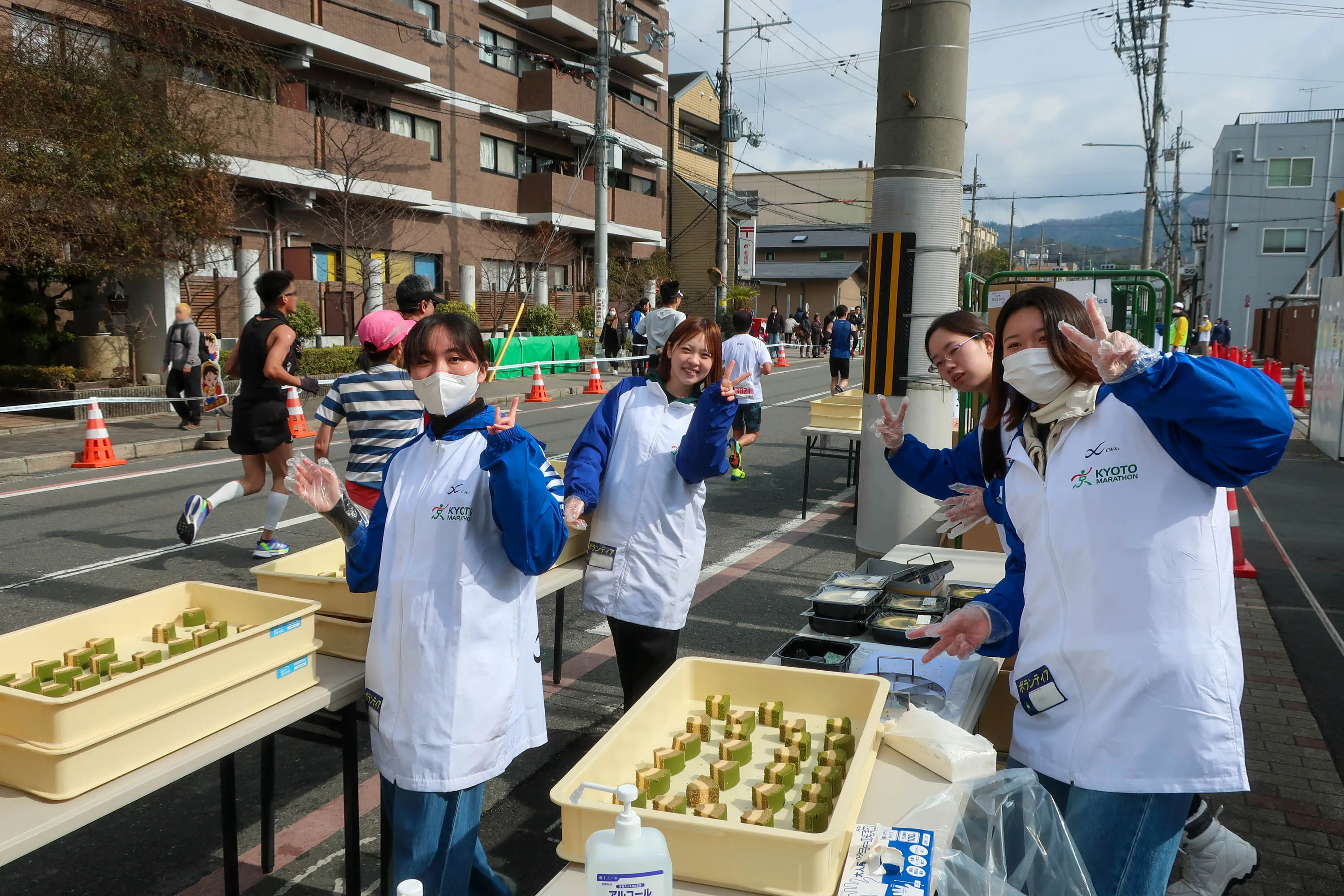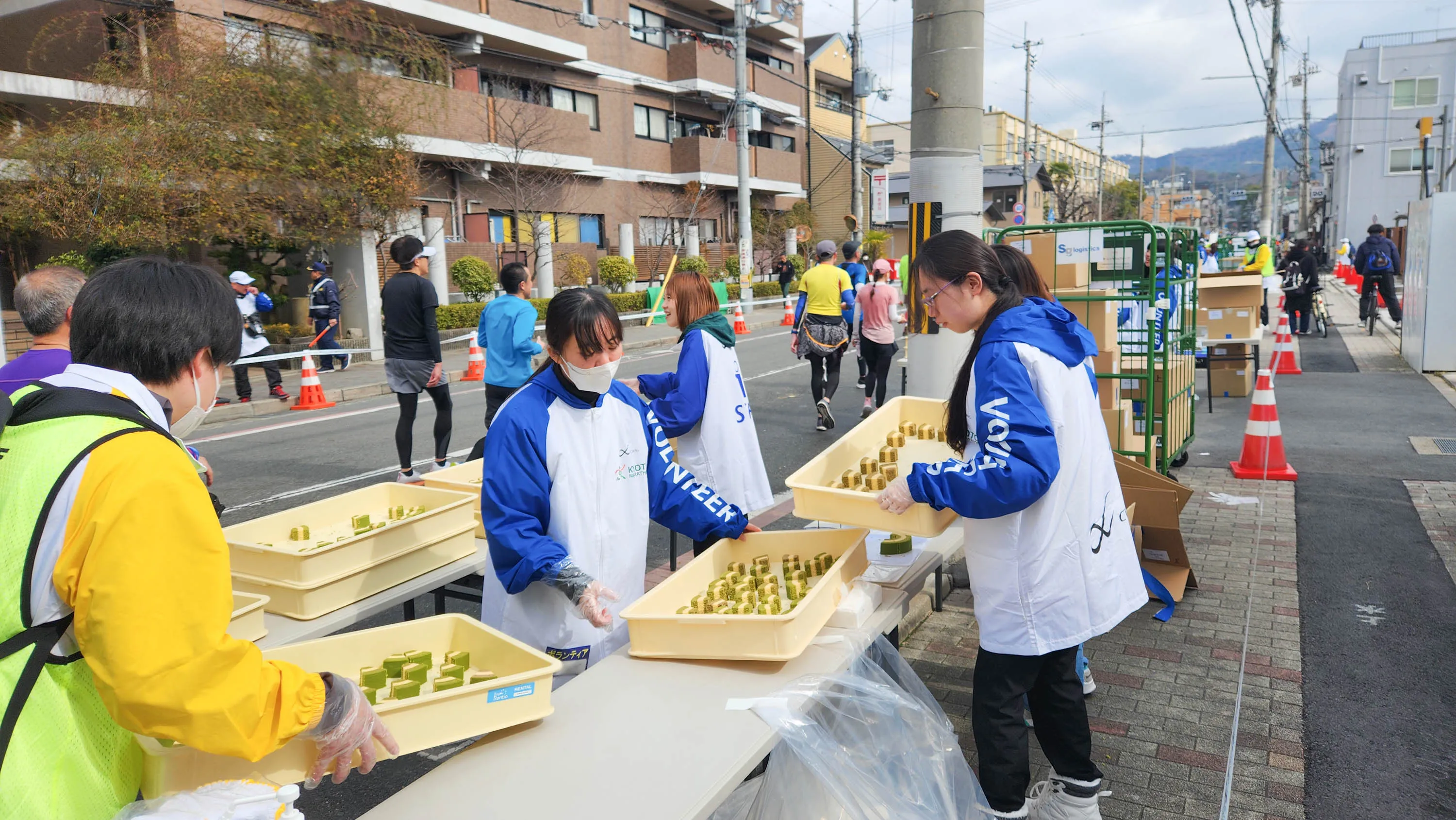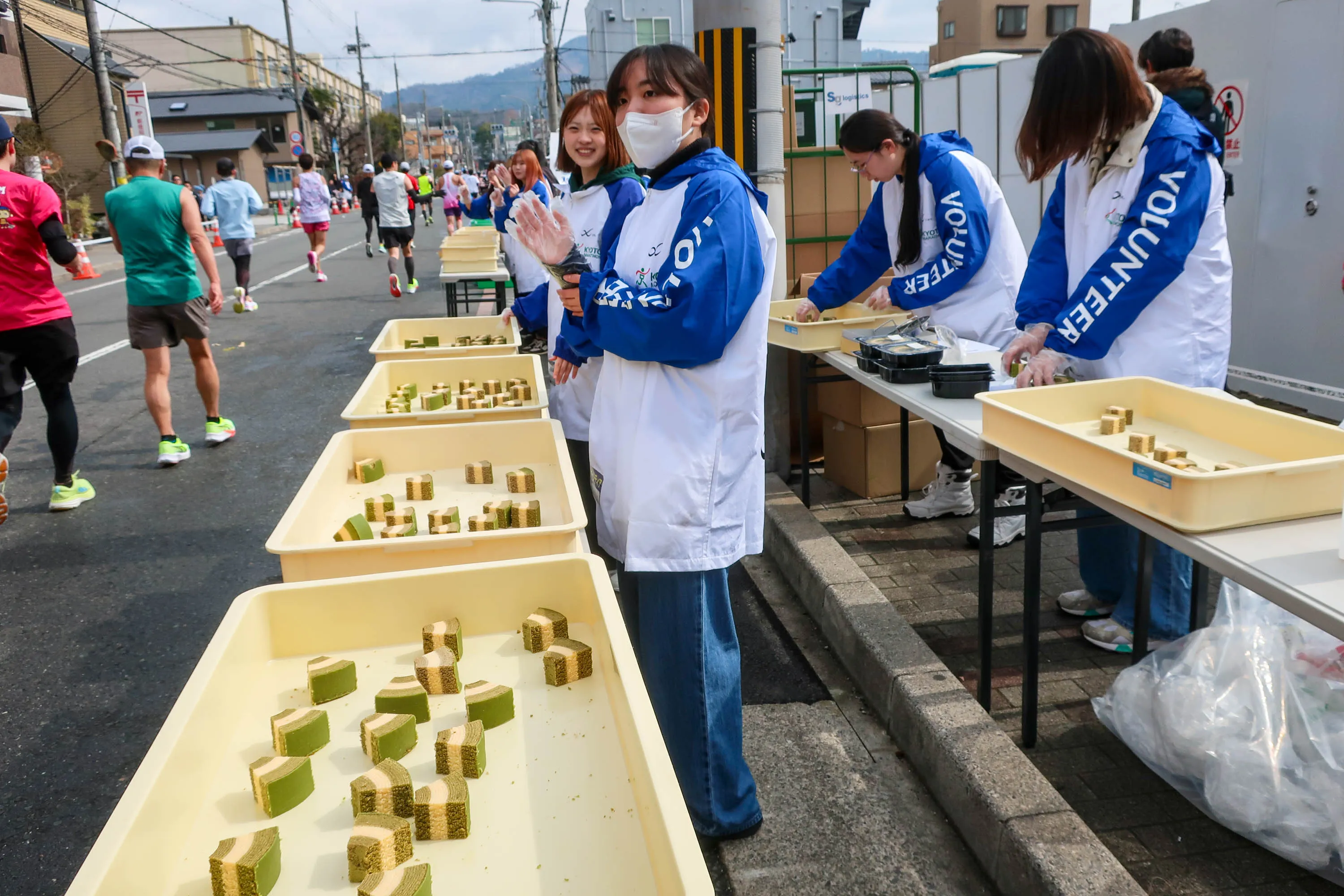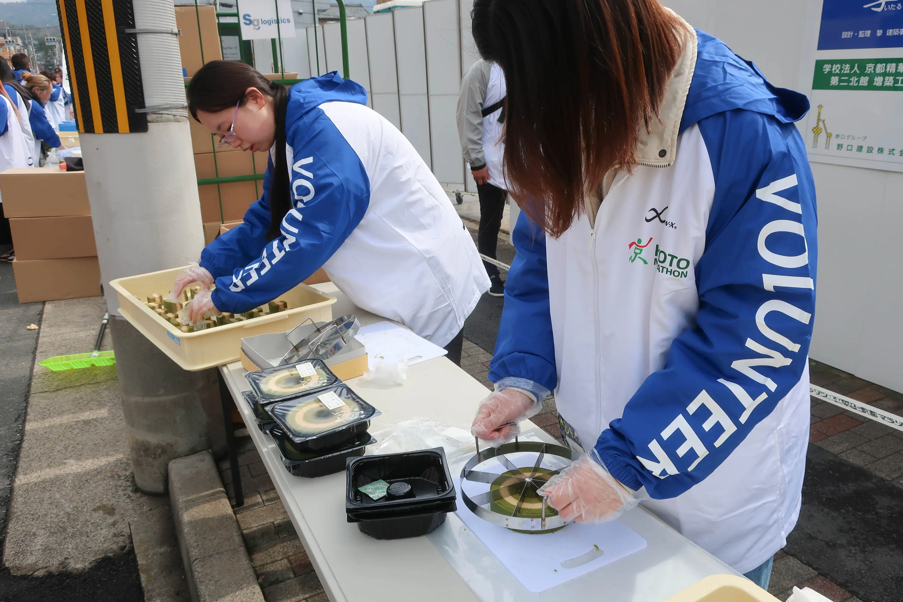 今年はランナーの皆さんの給水をサポートするだけでなく、京ばあむの給食も担当。食べやすいように切って提供を行いました。