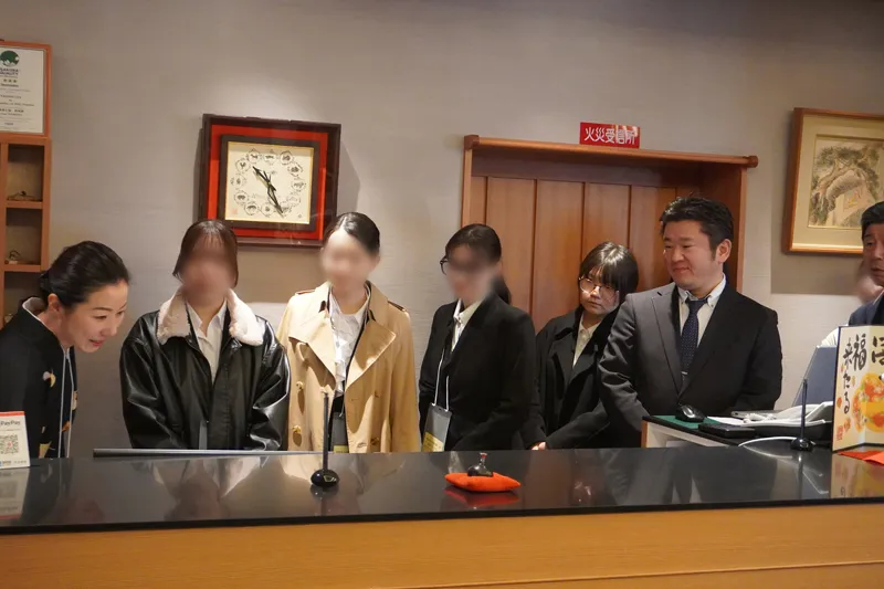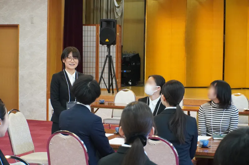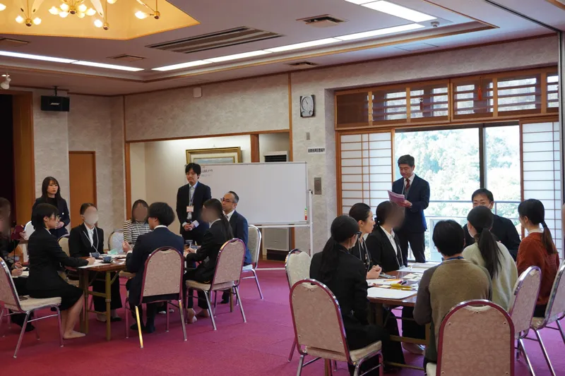 本学からは国際観光学部の学生が参加。旅館業界での仕事の魅力ややりがい、ホテルと旅館の違い、観光客とのコミュニケーション、サービスの在り方、働き方の実態などについて、宿泊事業者の皆様と意見を交わしました。